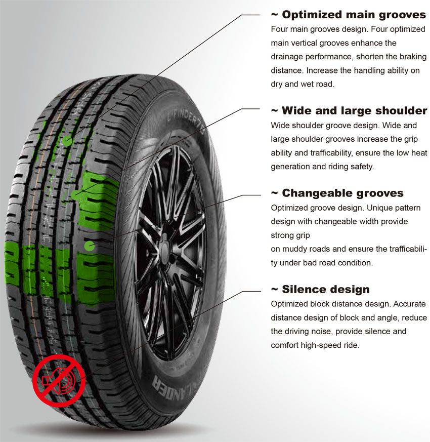 Four main grooves design. Four optimized main vertical grooves enhance the drainage performance, shorten the braking distance. Increase the handling ability on dry and wet road